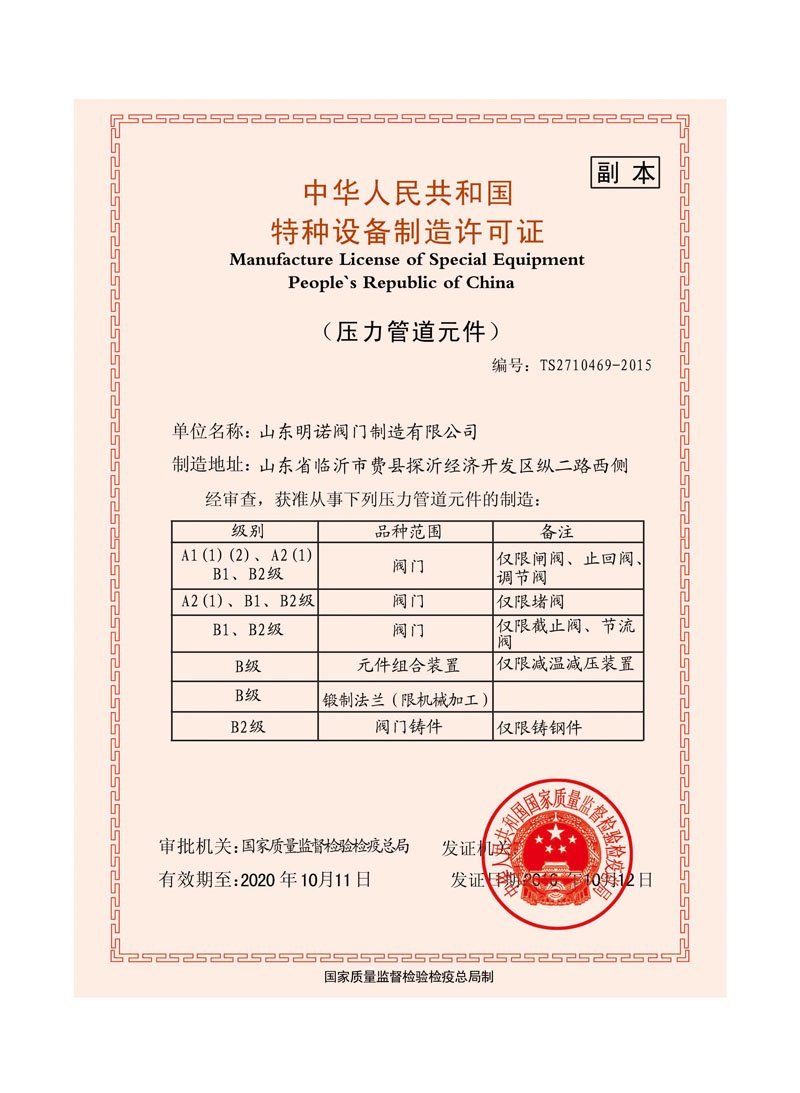 特種設(she)備制造許可證(zheng)(安全附件及安(ān)全保護裝置)