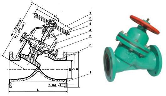 部件列表: 1、閥體(tǐ) 2、閥體襯裡 3、隔膜(mó) 4、閥瓣 5、閥杆 6、閥蓋(gài) 7、手輪